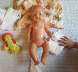 Ich übe schon mal Wickeln mit Klara, wenn Mama bald mit meinem Geschwisterchen aus der Klinik kommt.