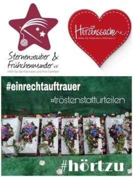 „Herzenssache – Nähen für Sternchen und Frühchen e. V.“ und „Sternenzauber & Frühchenwunder e. V.“ wollen diese Unmenschlichkeit nicht dulden. Wir setzen uns gemeinsam für Eltern, die ihr Kind verloren haben, ein und kämpfen. Kämpfen gegen die Ignoranz und die Vorurteile. Kämpfen für die Möglichkeit zu trauern. Wir werden auch weiterhin den Eltern einen würdevollen Abschied ermöglichen, sie weiterhin mit unseren Sachen ausstatten und ihnen auch weiterhin zur Seite stehen. Denn DAS brauchen sie: Unterstützung. Keine Gegenredner oder Zunichtemacher, die ihnen auch noch den letzten Moment nehmen wollen. Sterneneltern müssen sich verabschieden können, müssen trauern können. Sie haben ihre Kinder nicht freiwillig hergegeben. Glaubt diese Gruppierung wirklich, dass die Eltern gern auf ihre Kinder verzichten? Ist es nicht viel mehr so, dass Sterneneltern alles dafür tun würden, um ihre Babys bei sich zu wissen?