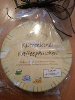 Ich habe mich gerade über ein kleines Mitbringsel einer Bekannten gefreut, die weiß, dass ich als Kaffeetante zwar viel davon konsumiere, aber das nicht als Pause zelebriert habe.