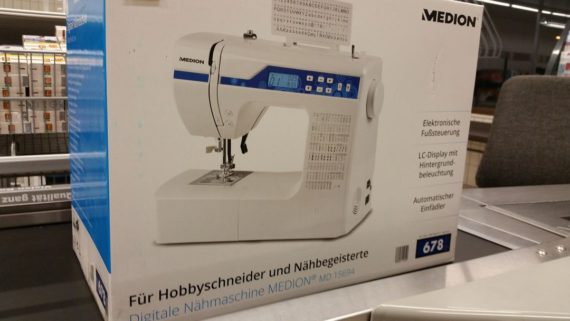 Als ich am Montag auf dem Weg war, um eine Spende für den Verein zu holen, habe ich beim Discounter noch einen Zwischenstopp eingelegt, um eine Nähmaschine zu shoppen. Meine Teamleiterin wollte gern ein Foto und ich hatte schon eine genaue Vorstellung im Kopf, wie es aussehen soll. Irgendwie kam alles anders, da ich das Treffen mit der Spendenübergabe im Kopf hatte und Hunger hatte ich auch. Also bin ich ohne Einkaufswagen rein und gleich zum mittleren Gang mit den Angeboten geflitzt, habe mir die vorletzte Maschine geschnappt und geduldig an der Kasse gewartet, bis die Verkäuferin kam.